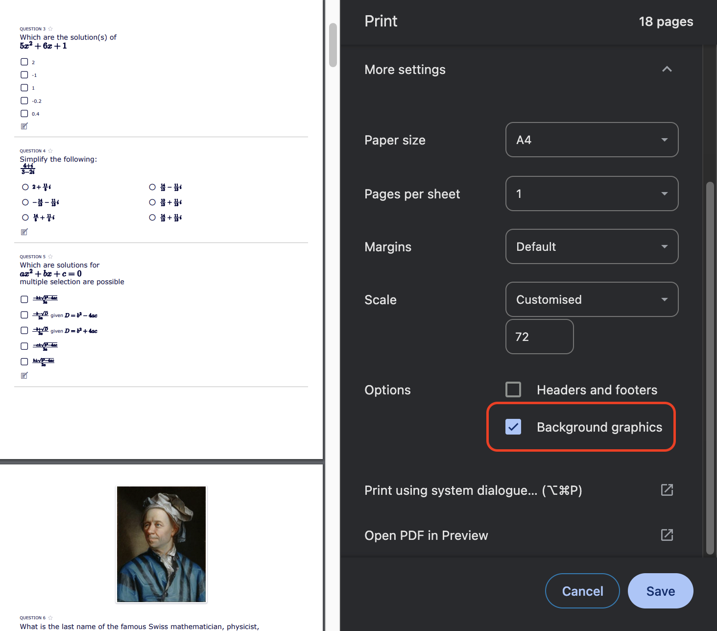 Intended as a measure to save on ink, some browsers may disable background images by default when you try to print webpage-based content. Some images in BookWidgets (notably in Annotate image question type in a Quiz or Worksheet widget) may hidden from the PDF/print as a consequence of this setting. If applicable, make sure to enable this setting before printing or saving.